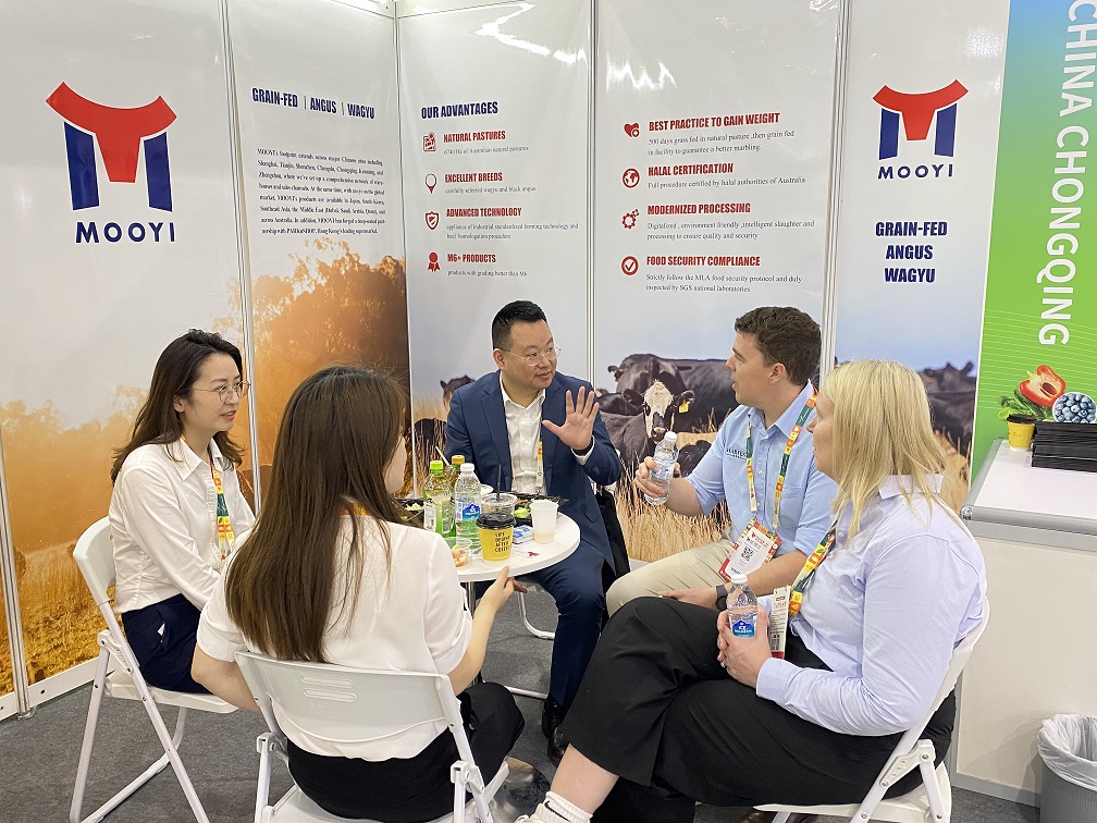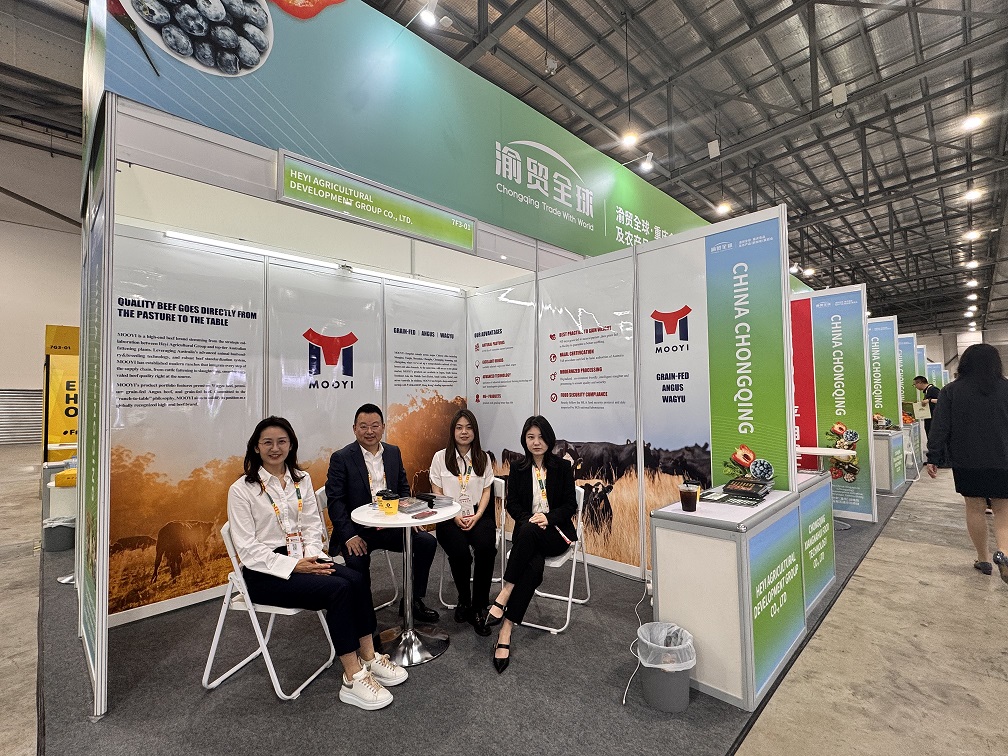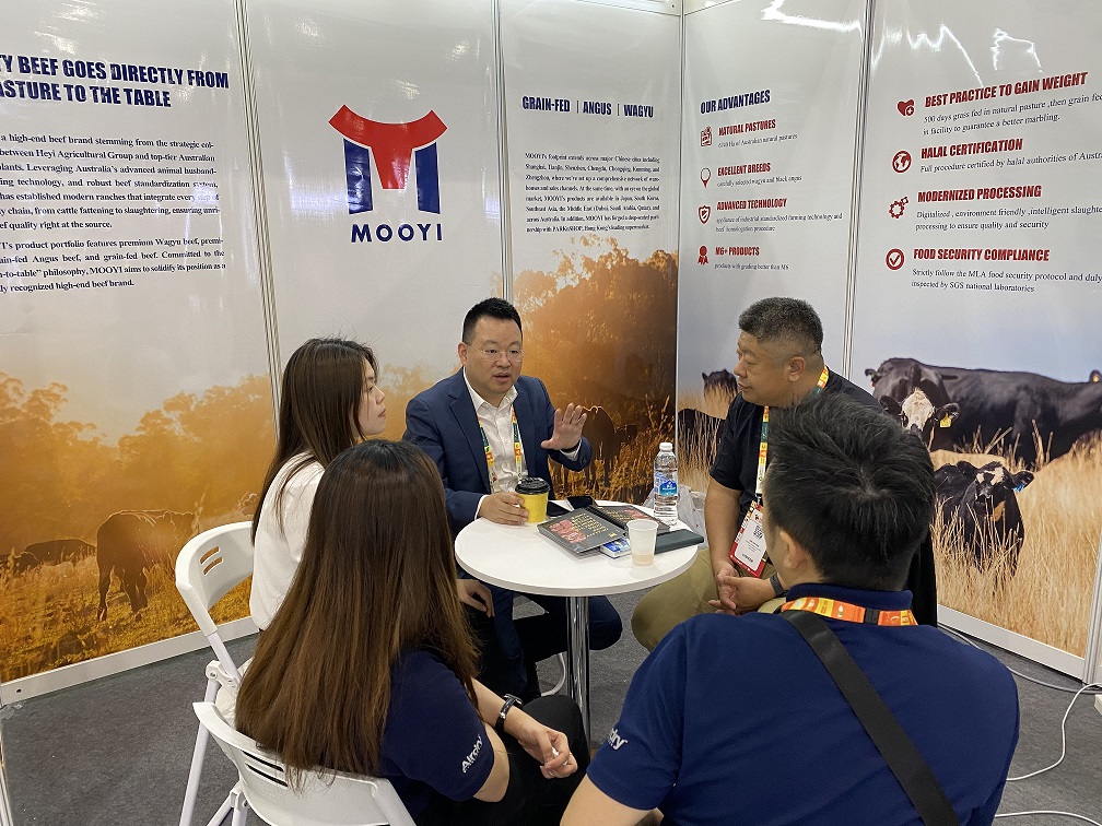 During the exhibition, MOOYI’s booth was bustling with visitors. Industry partners and international buyers from Southeast Asian countries, including Singapore, Malaysia, and Thailand, frequently visited to discuss topics such as the breeding standards of beef products, quality control procedures, and consumption trends in the Southeast Asian market. The MOOYI team shared its expertise in the meticulous breeding of grain-fed Angus and Wagyu cattle and exchanged insights with domestic and international counterparts regarding beef product import and export policies and supply chain optimization. This enabled them to gain a more profound understanding of regional market demands and amass practical experience for further expansion in the Southeast Asian market.